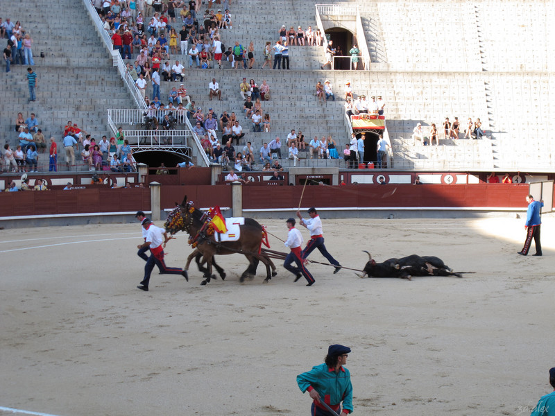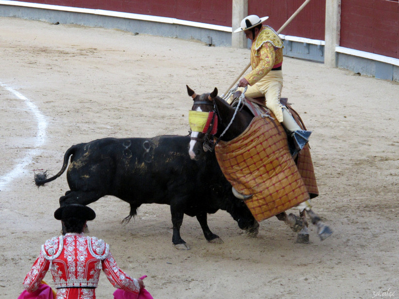 | 03.07.2010 суббота Мадридский аэропорт Barahas (MAD). ![]() Международный терминал T4S поразил колоссальными размерами, удивительной архитектурой и.. почти полной пустынностью. Видимо, наш рейс, к тому же несколько задержавшийся, на сегодня последний. Выбираться из зоны прилета в город помогают множество горизонтальных транспортеров, автоматический метропоезд, лифты и эскалаторы, но все равно получается не быстро, минут 30-40 - уж больно необъятны просторы. Багаж не задерживают, граница проходится мгновенно, так что время уходит, в основном, на пешее «путешествие». Час поздний, и нам уже не до экспериментов по транспортировке на метро - берем такси. В отеле нас ждут, и менеджер на ресепшн первым делом вручает мне запечатанный конверт. Я было подумал, что это какое-нибудь стандартное приветственное письмо.. Ан нет, это билеты на корриду! О которых я уже успел позабыть в отъездной суете. 04.07.2010 Апарт-отель Sercotel Apartamentos Togumar 3* (40° 26.622'N 3° 40.371'W). ![]() Номер на троих - о двух комнатах, небольших, но удобных. Зеркальные шкафы визуально расширяют пространство. Мини-кухня скрыта за той же зеркальной панелью. Есть почти всё, что нужно, чтобы приготовить себе завтрак-ужин. Главное, конечно, микроволновка - только кастрюль нет. Кондиционер есть, но не нужен. Район тихий, и выход окон на улицу не доставляет неудобств. Несмотря на то, что это апартаменты с кухней в номере - здесь предлагают завтрак, шведский стол. Оказавшийся вполне приличным. Наутро отправляемся на метро в Прадо (Museo Nacional del Prado). Станция Prosperidad - в пяти минутах от отеля, прогулочным шагом. Пересадка на станции Goya, на ней выставлены три известные серии гравюр Франсиско де Гойи. Репродукции, конечно. Исполнены по современный технологии, но это не мешает. С удовольствием порассматривали бы их, но.. потом, потом.. Мы не спешим, но ведь мы же и так едем в Прадо.. Не отвлекаться мы все-таки не можем :). Задержались поснимать в парке по пути .. ![]() .., так что в Музее оказались лишь спустя два часа после выезда из отеля. На входе высечены имена мастеров. ![]() Вверху - величайшие из великих. С удовлетворением отмечаю, что среди них есть и «мой» испанец :). Да-да, еще по дороге в Прадо я вспомнил, что, помимо всемирного значения этого музея, у меня есть еще один, личный, повод для его посещения...