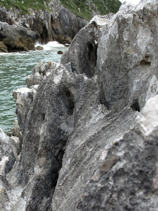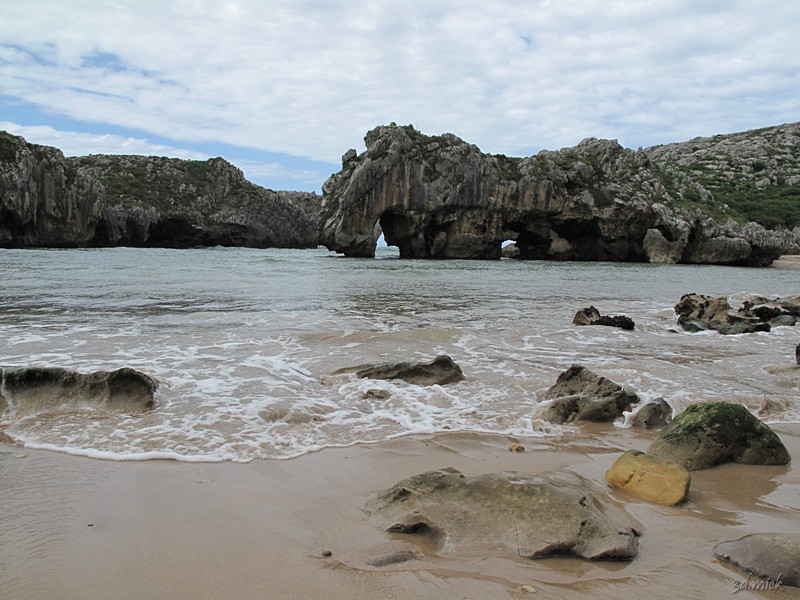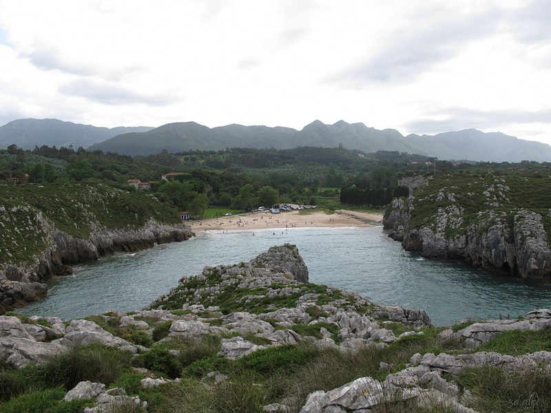 | 14.07.2010 среда Итак, успешно пополнив запас флеш-карт, едем в Астурию, на берег океана, Бискайского залива. Выезд в 11:10. В двенадцать часов мы уже на скоростной трассе на Овьедо (Oviedo) / Хихон (Gijón). Немного не доезжая их, надо будет свернуть направо. 12:50, небольшая остановка на подвернувшейся площадке для отдыха. Температура воздуха 22 °C. Меняем водителя, за рулем теперь Алекс, штурман Лена. ![]() Платные участки дорог, как и другие авторасходы, оплачиваем везде нашей вспомогательной картой, предназначенной для небольших платежей. Всего у нас две рабочие банковские карты для этой поездки, к обеим основным выпущены дополнительные, так что у каждого члена команды - по две пластиковые карточки. Хоть и магистраль, а посмотреть есть что. ![]() A-66 Autovía Ruta de la Plata (Автомагистраль Дорога Ла Платы). Ruta (или Via) de la Plata переводится как Дорога Серебра. Хотя есть мнение, что к серебру название этого древнего пути не имеет отношения и происходит от созвучного испанскому plata арабского слова, означающего мощеную дорогу, какой ее сделали римляне. Испанцы очень любят строить вантовые мосты. ![]() Может, потому что умеют их делать, а может, потому что красиво. Наверно, всё вместе. Ближе к концу перегона на север - дозаправка, Лена меняет за рулем Алекса. Незадолго до побережья, съезд на Picos de Europa (национальный парк 'Пики Европы') и Ковадонгу. Жаль, в этот раз не судьба.. ![]() У нас планировался день на Пики Европы, но получается, что его мы тоже потратили на Сантьяго. Дорога от отеля заняла четыре с половиной часа. Прибыли с опозданием по отливу часа на два. По-божески.. (между минимумом и максимумом уровня воды - шесть часов). Нашли почти сразу, в конце на развилке надо было как дорога ведет, а не по навигатору (координаты-то неточные были). Мы у цели, Playa de Cuevas del Mar (исп. Пляж Морских Пещер) 43° 27.403'N 4° 56.227'W (теперь координаты верные) ![]() Почему не получалось привязать фотографии к береговой линии - я понял тут же. Фото были сделаны в отлив, космоснимок - в полуприлив, а очертания здешней бухты меняются быстро и кардинально. Арки уже заливает, так что надо поторапливаться. Мы с Алексом почти на ходу снимаем обувь и шлепаем на маленький отдельный пляжик направо от основного. Маленькие пещерки по пути, к некоторым уже подбирается вода. ![]() До арок Алекс добрался вброд и вплавь. ![]() На входе в бухту - мыс, похожий на авианосец. ![]() Без Аквапака (Aquapac, водонепроницаемый прозрачный фоточехол, см. заметку Фотоаппарат в воду взять можно. И нужно), этот снимок сделать было бы нереально. Хотя надо было нормальный подводный бокс брать, он удобнее. На дальнем пляжике - никого. Чуть позже станет ясно, почему. ![]() Кроссовки зря так оставил.. До воды вроде бы далеко, но это очень обманчиво. Шмотки я перебросил в булыжниковую часть пляжа, повыше. Кто бы мог подумать, что и этого окажется недостаточно.. Вода прибывает быстро - размах прилива, в эти дни, около 4 м, это означает подъем 60-70 см в час. Спасибо вернувшемуся через некоторое время Алексу, спасшему уже мои вещи, до которых почти добрался появившийся прибой. Скалы разные - есть почти гладкие, а есть кремнёвые с острыми краями. ![]() Иногда очень острыми - прямо фабрика ножей каменного века. ![]() В прилив, плавать в арках опасно. Неосторожное касание острых краев скал приводит как минимум к глубоким царапинам. Приложит волной - кости можно и не собрать. Если волны сейчас нет - 