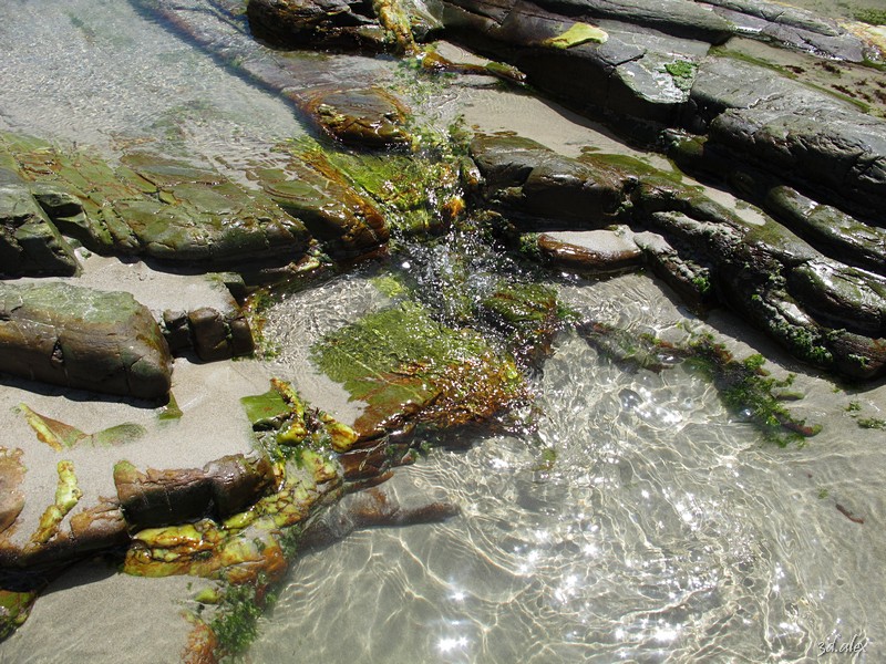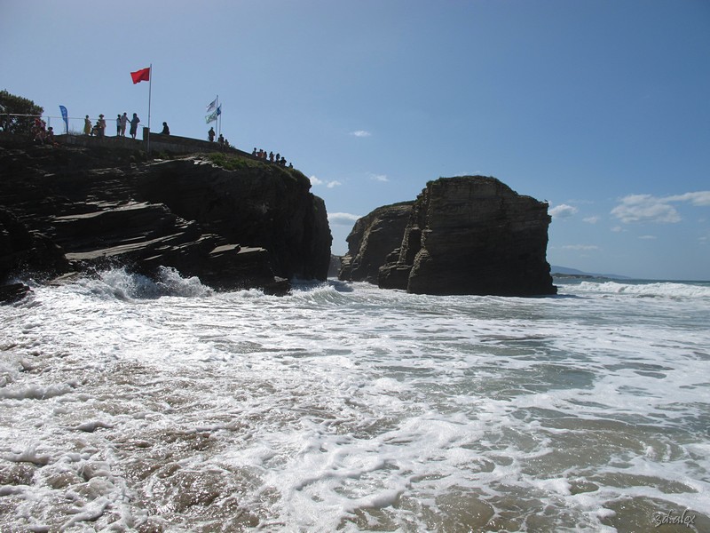 | 15.07.2010 четверг 10:20, отправляемся и едем на запад. Дорога (A-8 Autovía del Cantábrico, Кантабрийская Автомагистраль) идет вдоль северного побережья. В Галисию въедем уже в третий раз. Сегодня второй из двух самых-самых пляжей, которые удалось включить в маршрут из отобранных для себя двух десятков. Температура воздуха 24 °C (время около 11 часов). .. Строят испанцы много и масштабно. Пишут, у них четвертая крупнейшая в мире дорожная сеть, после США, Китая и Канады. Нужный поворот в сторону океана перекрыт из-за стройки, проезжаем прямо, ищем ближайший съезд вправо. В итоге, подъезжаем к пляжу не с востока, а с запада. Двухполосная дорога приводит прямо к домику ресторана .. ![]() .., по надписи на котором легко догадаться, что да, он здесь: Playa de Las Catedrales (исп. Пляж Кафедральных соборов; галис.: Praia das Catedrais) 43° 33.236'N 7° 9.508'W Это туристическое название Пляжа Святых Вод (исп./галис.: Playa de Aguas Santas / Praia de Augas Santas). В 2008 году, некий французский туристический журнал провел опрос, предложив выбрать лучшие из 8000 пляжей мира. На первом месте в Европе оказался Пляж Кафедралов. «An absolute must», по выражению на TripAdvisor.com (англ. Абсолютно обязательное [к посещению]). Чуть дальше - автостоянка, но всё занято. Затем вторая, побольше, тоже заполнена. Но следующая - совершенно свободна. Это просто большой кусок луга, отмеченный полосатой ленточкой. Пяток машин, ошарашенные простором, жмутся первым рядом к дороге. Мы смело проезжаем дальше, к самому берегу. ![]() Основав :), как потом оказалось, второе, более внушительное, скопление. Дорога от отеля до пляжа заняла два с половиной часа. На этот раз, мы вовремя. Поспели как раз к отливу. ![]() (кликните на картинке, чтобы увидеть эту панораму в большем размере) Народ уже вовсю гуляет по дну морскому. А разгуляться здесь есть где - пляж длиной около полутора километров и шириной в сотню метров. Малыши возятся в мелком озерце рядом со спуском на пляж. ![]() Вода там пресная - это ручей. Где-то левее - водопад (воды в нем, правда,.. как в душе). Взрослые с детьми постарше любят «покорять» арку десятиметровой высоты. ![]() Поймать момент, когда наверху никого нет, - не очень просто. Еще бы - вход на нее совсем не сложен. (см. также выше, скала в левой части панорамы пляжа) В некоторых местах, океанская вода гуляет во всех направлениях .. ![]() .., образуя водовороты .. .. и микроводопадики. ![]() Вода может прийти даже с противоположного направления, не с океана, а от скал. То есть, заходит в одном месте, а выходит в другом. Когда не видишь ее вторжение на пляж, подкрадывающаяся с тылу вода вызывает поначалу некоторое удивление. Весь этот водогульбарий периодически порождает эфемерные, живущие несколько десятков секунд, рисунки на песке. ![]() Слева - перекат через камень. Справа - тот же камень, несколько секунд спустя. Акваграфика. ![]() Прибой вдали приличный, а камней много. ![]() Поэтому пляж закрыт для купания, вывешен красный флаг. Все и так понимают, что к прибою лучше не соваться, но спасатели ненавязчиво напоминают и на пляже - переносными табличками на шестах. Как бы увлекательно ни было наблюдать гидродинамику, самое интересное здесь - это скалы. ![]() Скажете, народу много на пляже.. Это вы его в августе не видели.. :) Однако, я бы не сказал, что люди мешают. Плотность их распределения очень неравномерна, а пляж большой. Найти ненаселенные участки очень легко. Арки на восточном краю пляжа напоминаю