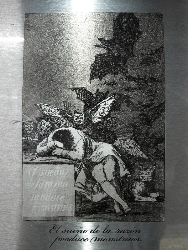 Особенное внимание привлекли высказывания мастера на такие актуальные темы как .. .. образование, .. ![]() No.37. Si sabrá mas el discipulo? (исп. Ученик не мог бы знать больше?) Во, меня так английскому учили сперва :) А у нас сегодня другая крайность: всё больше и больше. А ведь не надо слишком больше, надо лучше.. .. здравоохранение, .. ![]() No.40. De que mal morira? (исп. От какой болезни он умрет?) Да он уже, умер. .. управление, .. ![]() No.42. Tu que no puedes (исп. Ты, который не можешь) И тем не менее, всех устраивает.. .. искусство .. ![]() No.38. Brabisimo! (исп. Брависсимо!) Обезьяна, заметьте, изображает игру на перевернутой гитаре, струнами к себе. .. и информация. ![]() No.50. Los Chinchillas (исп. Шиншиллы) Один из комментариев автора: Los necios preciados de nobles se entregan á la haraganería y superstición, y cierran con candados su entendimiento, mientras los alimenta groseramente la ignorancia (исп. Надменные глупцы из знати предаются безделью и суевериям, и закрыто висячими замками их разумение, тем временем невежество их грубо питает.) Замки, как я понимаю, могут быть иногда открыты. Но где ключи?.. Достаточно одной этой таблетки.. Чтобы спустя столетие изобрести сюрреализм. И конечно, нельзя пройти мимо знаменитого No.43. El sueño de la razón produce monstruos (исп. Сон разума порождает монстров). ![]() Интересно, что смысл его не таков (или не совсем таков), как в современном применении, ставшем пословицей («Сон разума рождает чудовищ»). Первоначально, этот лист должен был стать первым в серии, и речь идет об искусстве (La fantasía abandonada de la razón produce monstruos imposibles. Unida con ella es madre de las artes y origen de las maravillas - исп. Покинутая разумом фантазия порождает невозможных монстров. Объединенная с ним, она - мать искусств и источник изумлений). Вроде бы, об искусстве.. Потому что ни один лист и ни одна подпись не однозначны. Для этого офорта, в другой рукописи, комментарий таков: Cuando los hombres no oyen el grito de la razón, todo se vuelve visiones (исп. Когда люди не слышат крик разума, всё становится видениями). Еще одна серия гравюр,